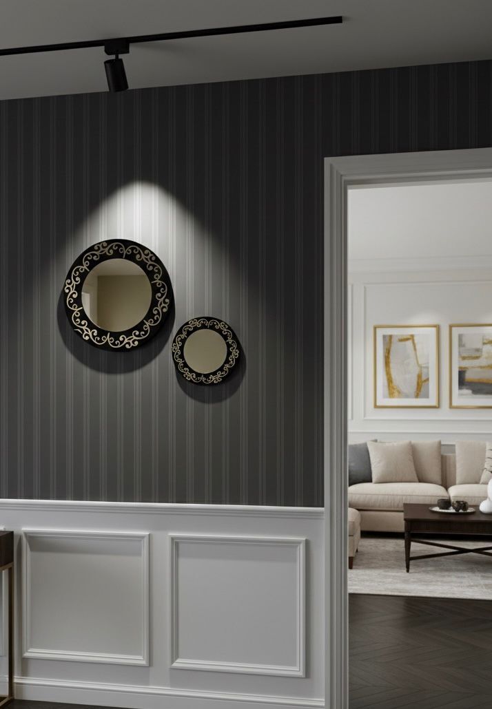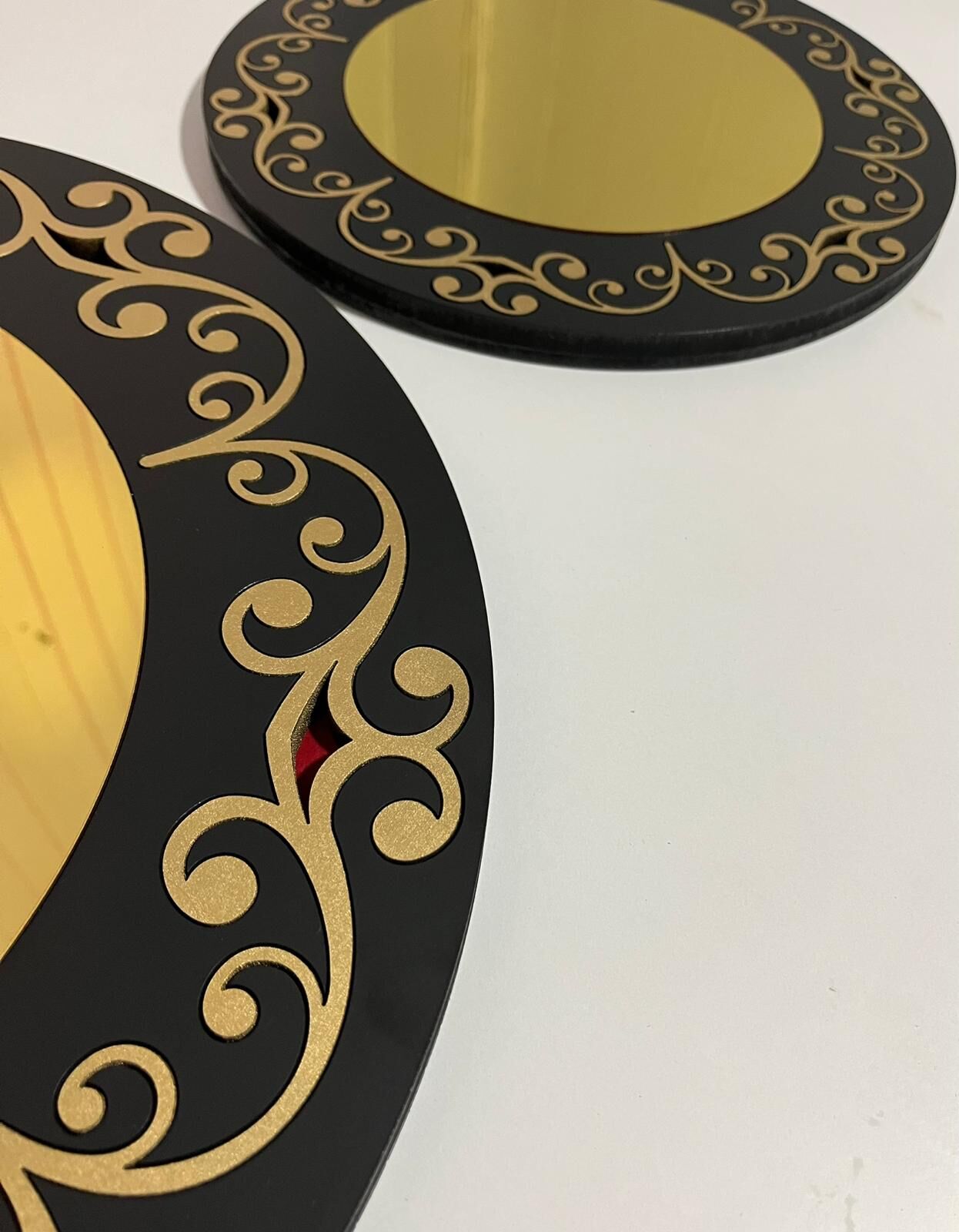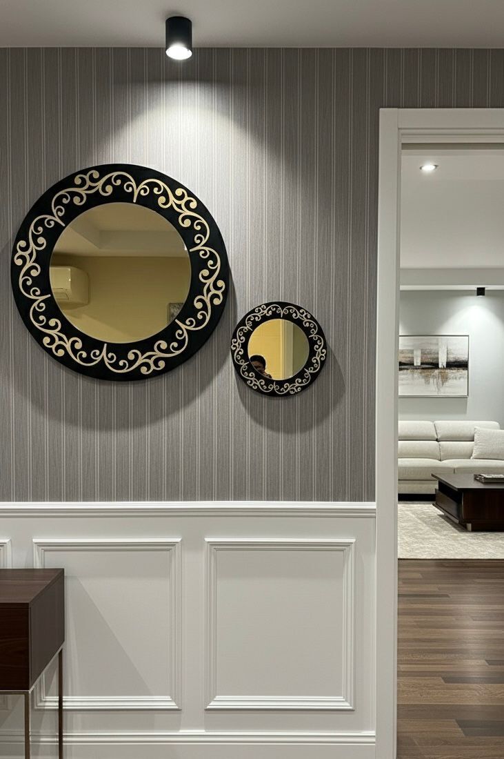 Altın Desenli Yuvarlak Duvar Aynası Seti, dekoratif görünümü ile duvarlarınıza şıklık katar.