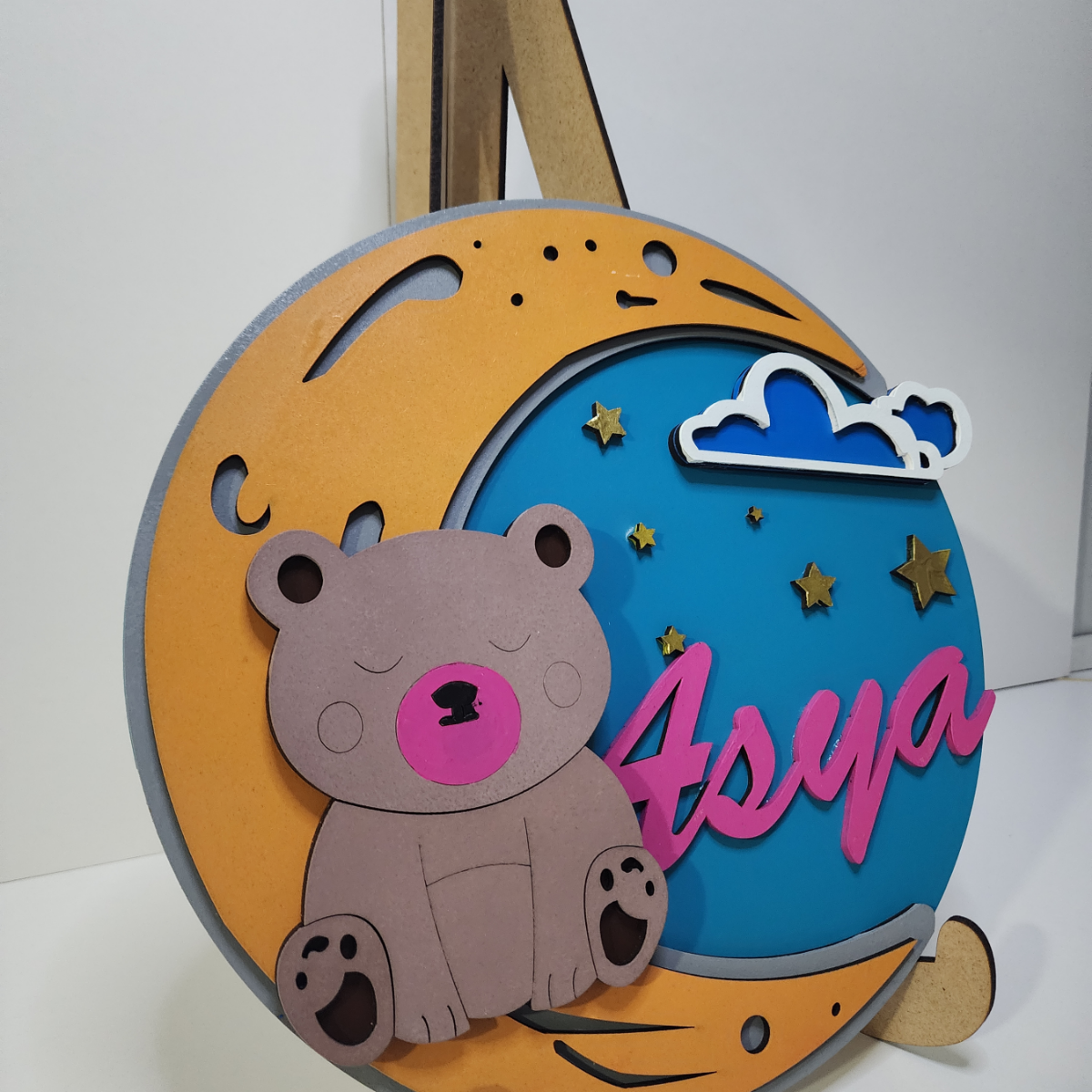 Yeni doğan bebek odaları için birebir, tamamen el yapımı bu özel bebek kapı süsü, kız ve erkek bebekler için özenle tasarlandı. Lazer kesim teknolojisiyle üretilen bu tasarım sevimli detaylarıyla dikkat çeker. Üretimde çocuk sağlığına uygun EN71-3 sertifikalı boyalar kullanılmıştır, böylece güvenle kullanabilirsiniz. Sevimli ve modern tasarım: Ay, yıldızlar ve bulutlarla tamamlanan ayıcık figürüyle dikkat çeken bir dekor.
