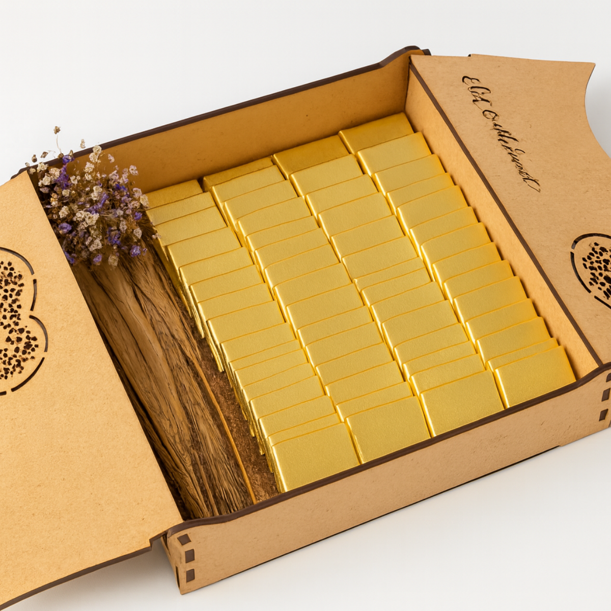 - Ürün İçeriği: 50/70/100 adet sütlü çikolata + kişiye özel lazer kesimli ahşap kutu