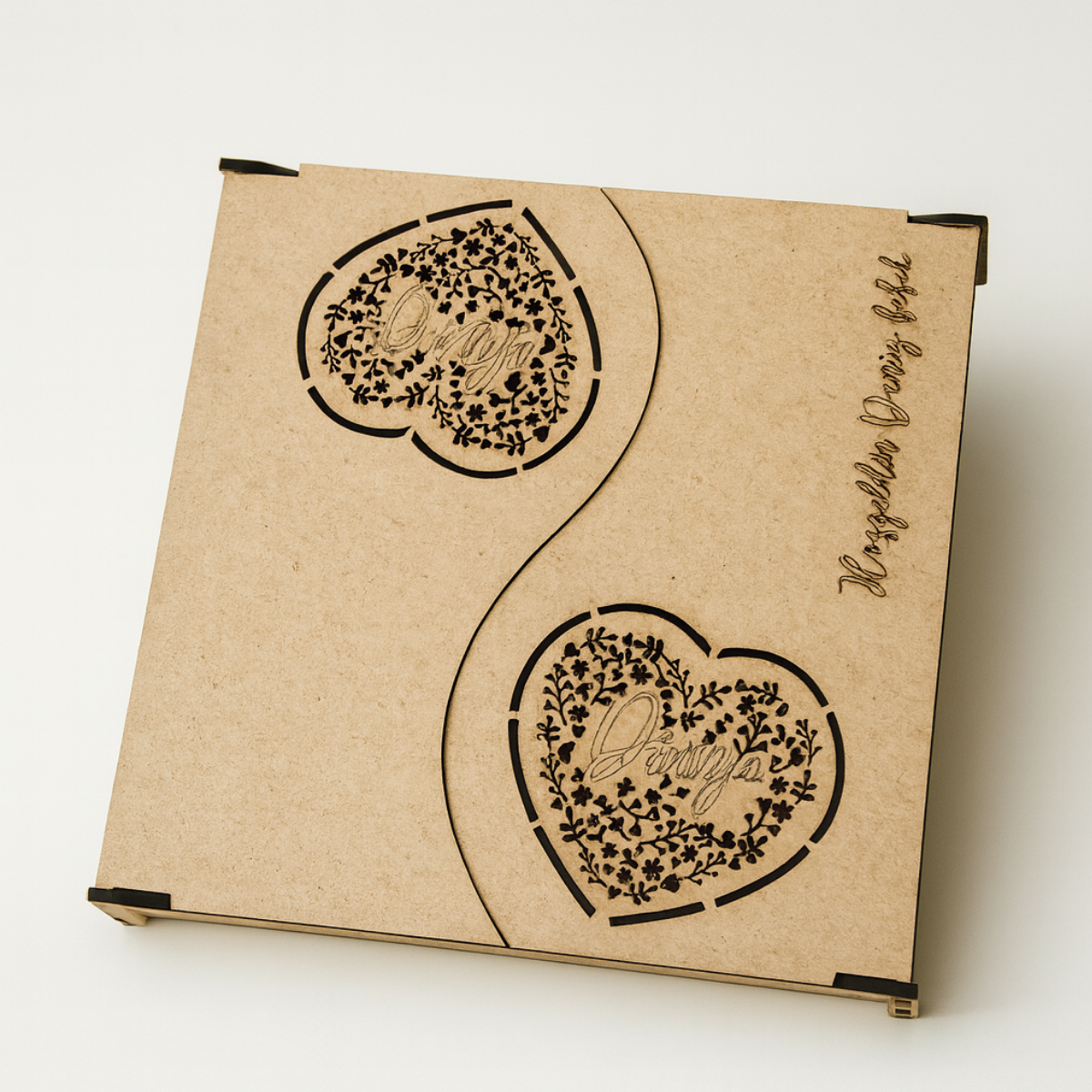 - Kutunun üzerindeki isim ve desenler lazer kesimle yapılır; yapıştırma veya sticker değildir