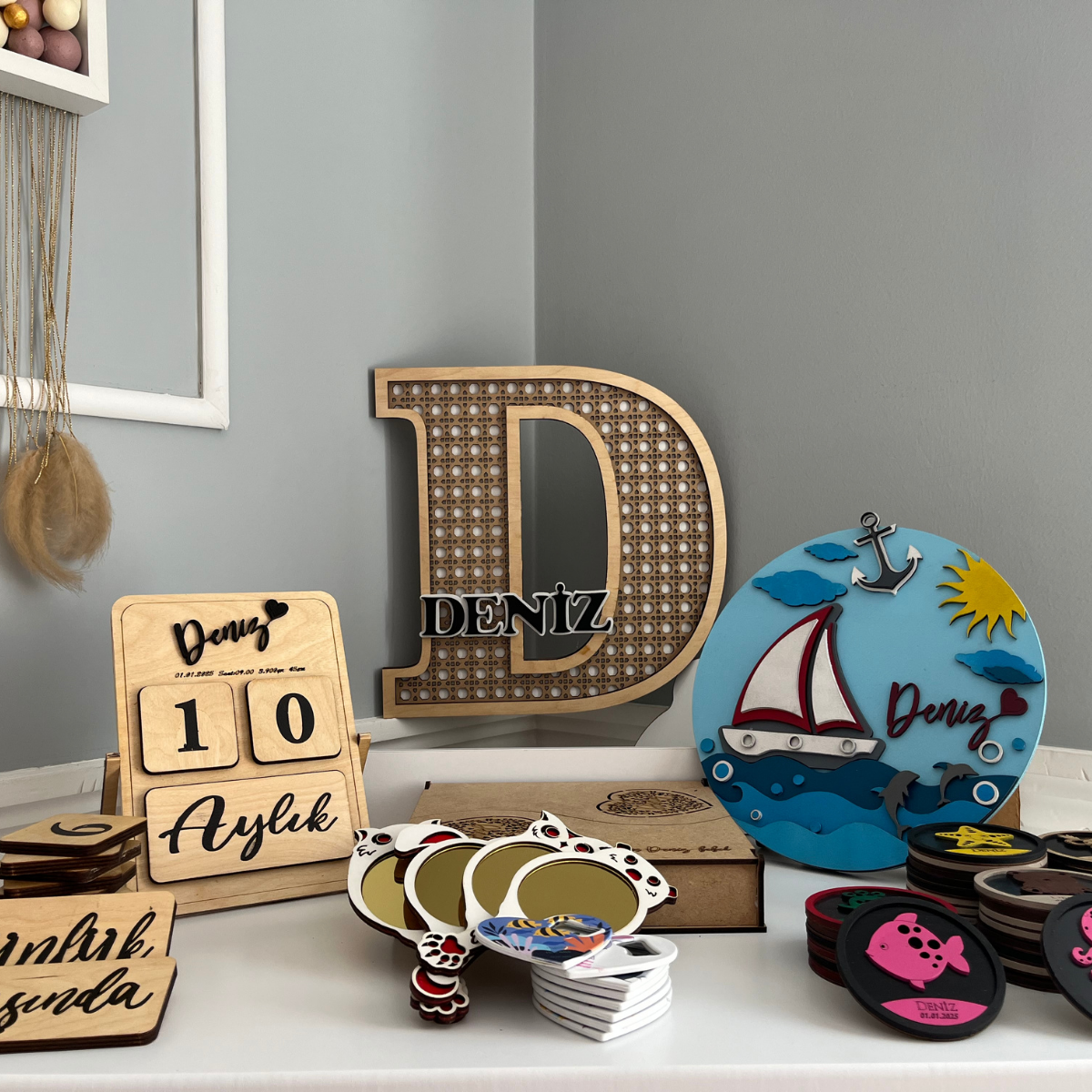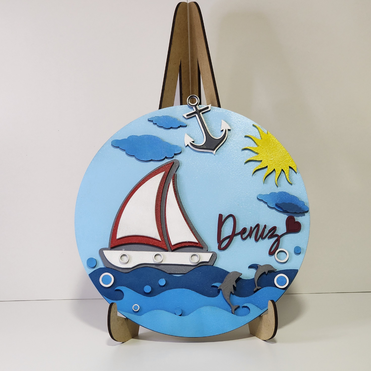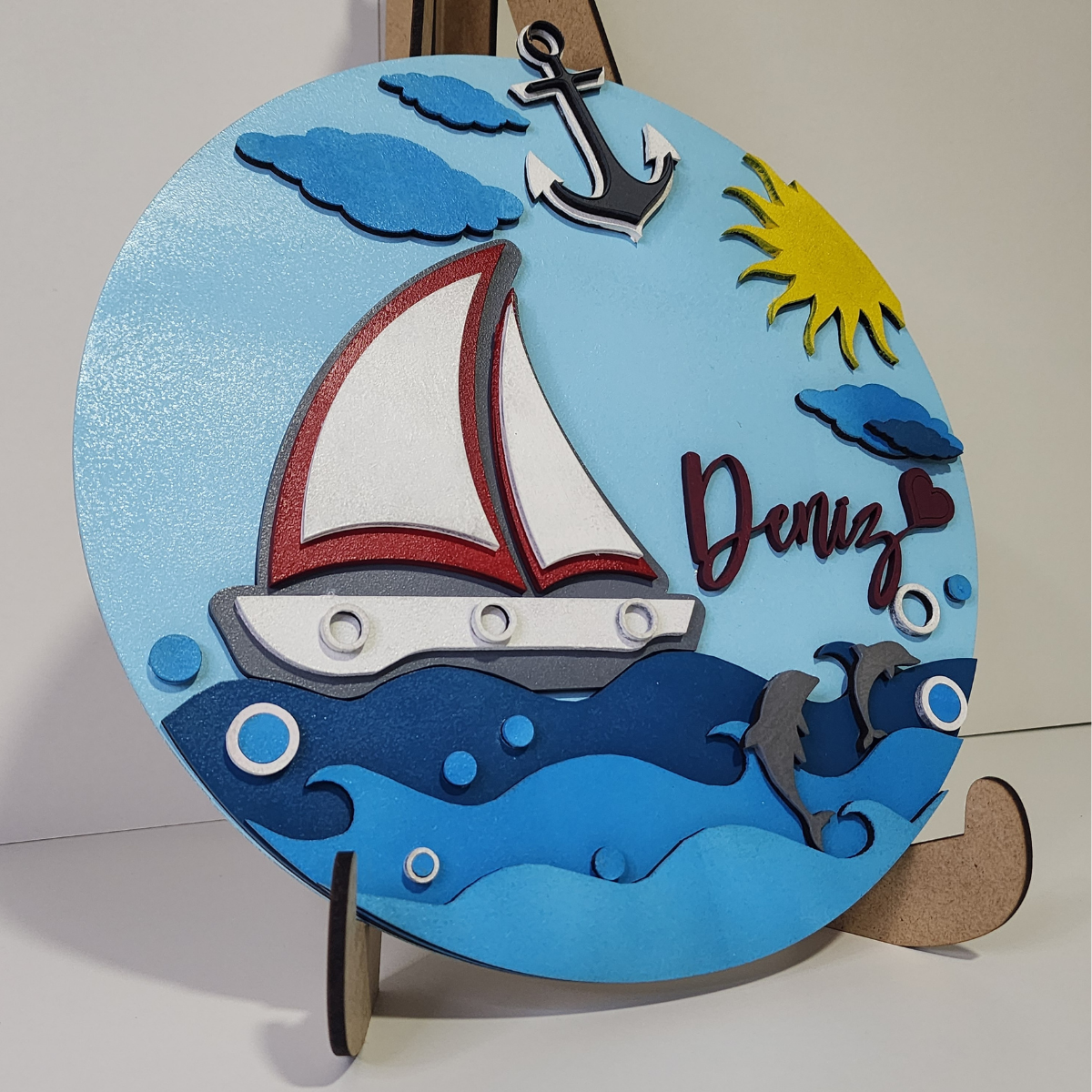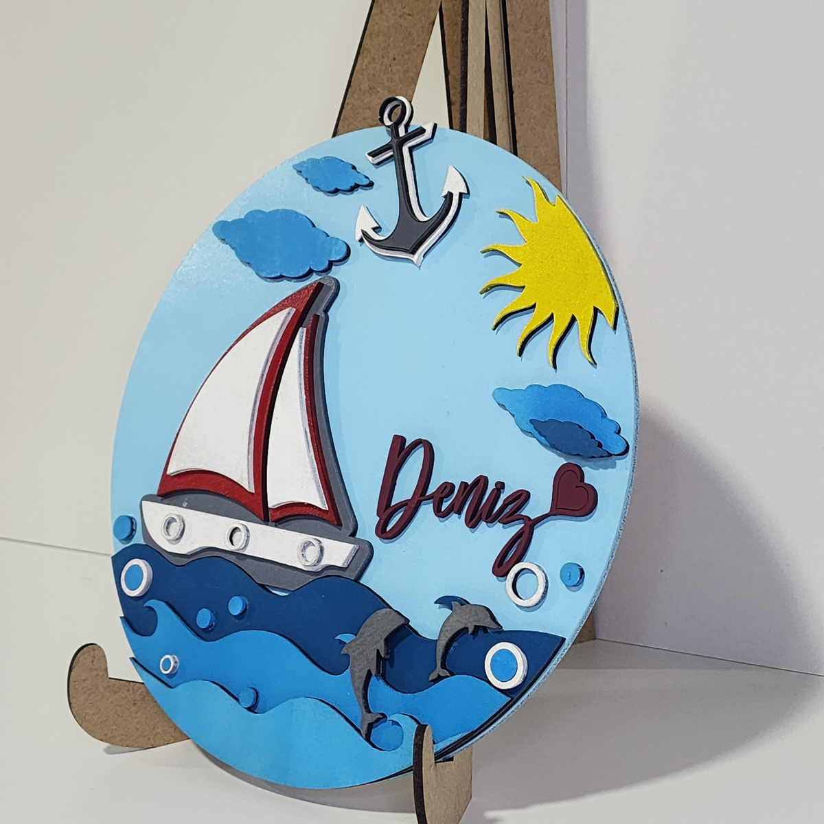 Yeni doğan bebek odaları için birebir, tamamen el yapımı bu özel bebek kapı süsü, kız ve erkek bebekler için özenle tasarlandı. Lazer kesim teknolojisiyle üretilen bu tasarım; deniz, güneş ve sevimli detaylarıyla dikkat çeker. Üretimde çocuk sağlığına uygun EN71-3 sertifikalı boyalar kullanılmıştır, böylece güvenle kullanabilirsiniz. Sevimli ve modern tasarım: Deniz, yunus ve gemi tasarımıyla tamamlanan dikkat çeken bir dekor