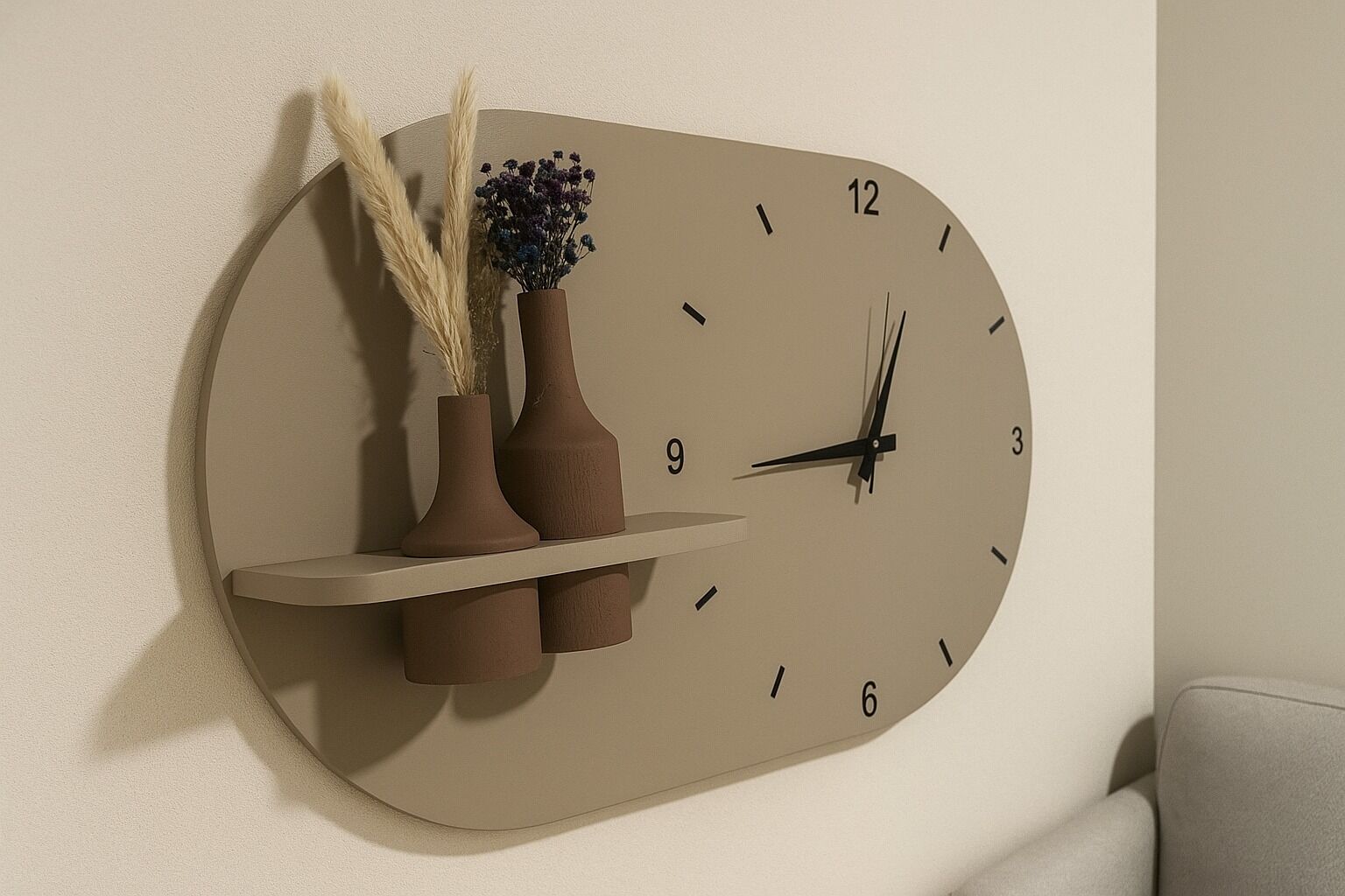 - Raflı ve Vazolu Tasarım: Saatin yanındaki entegre raf, dekoratif vazo ile tamamlanarak estetik bir görünüm sunar. Vazo ile birlikte gelir.
