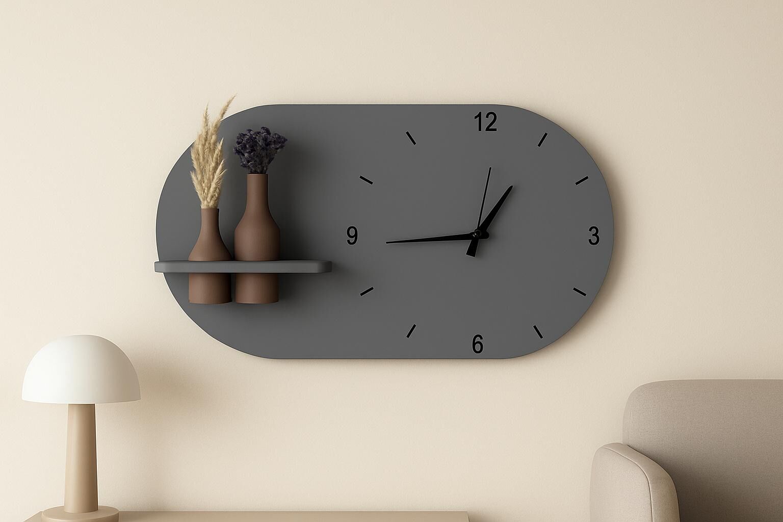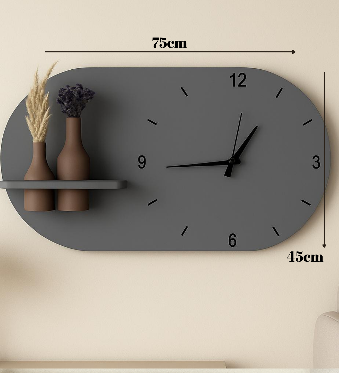 - Raflı ve Vazolu Tasarım: Saatin yanındaki entegre raf, dekoratif vazo ile tamamlanarak estetik bir görünüm sunar. Vazo hediyesi ile birlikte gelir.