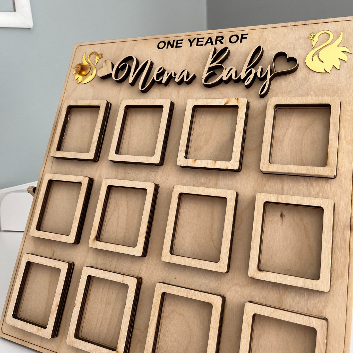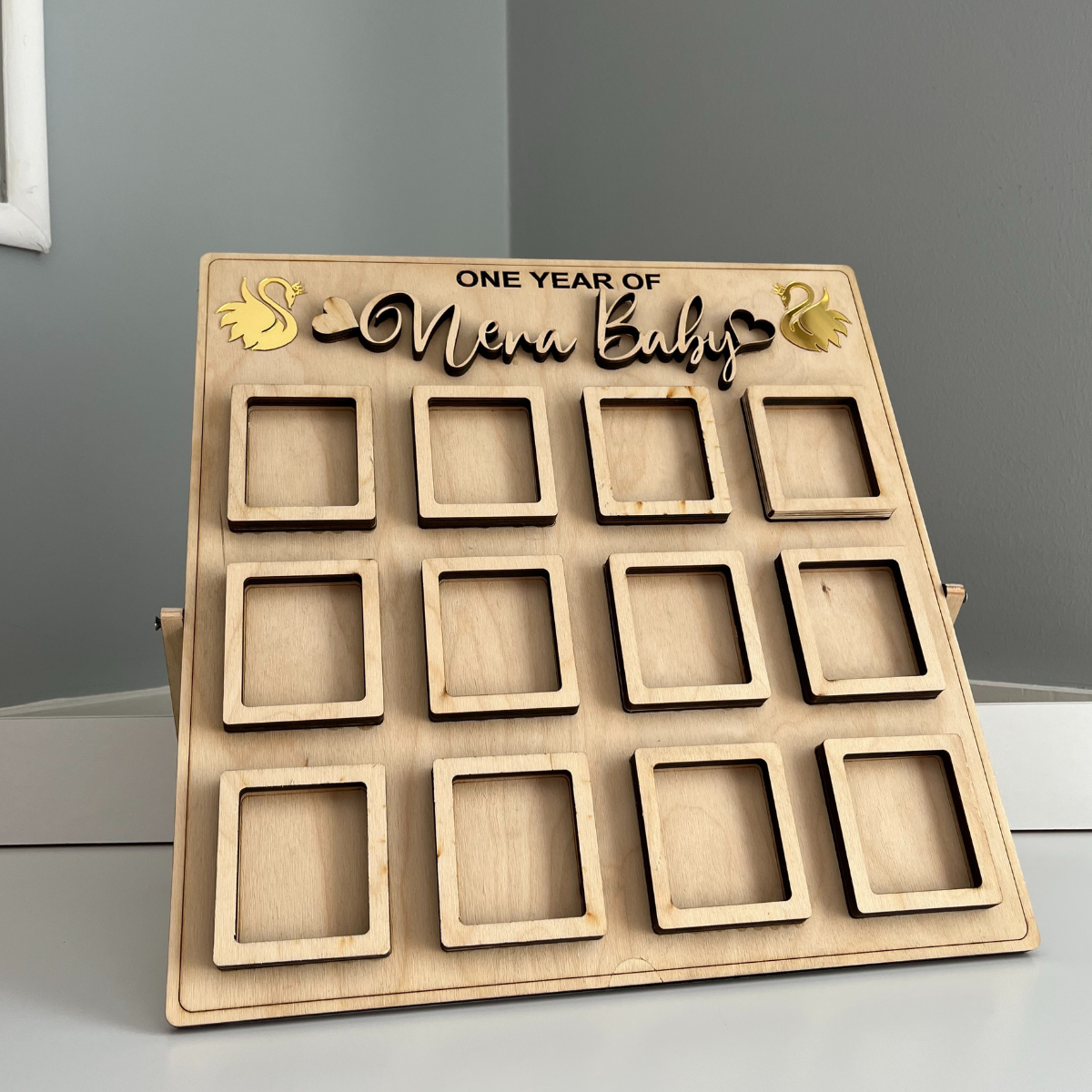 12 kare fotoğraf alanıyla bebeğinizin her ayını ölümsüzleştirebilir, yıl boyunca oluşan anıları dekoratif bir panoda sergileyebilirsiniz.